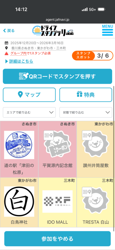 さぬき市、東かがわ市、三木町の計6か所の観光スポットのなかから、各自治体最低ひとつスタンプを集めて特典に応募できるというJAFナビが開催している企画。