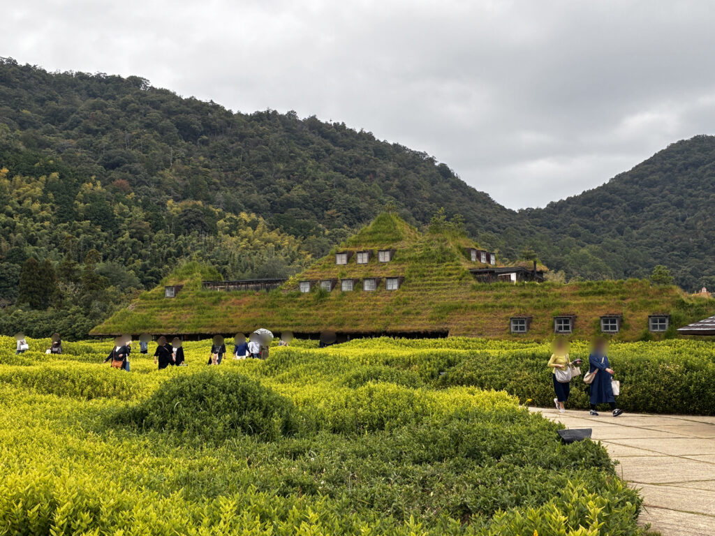 敷地内に入って最初に目に入るのは、緑豊かな景観の中にある草屋根の建物。