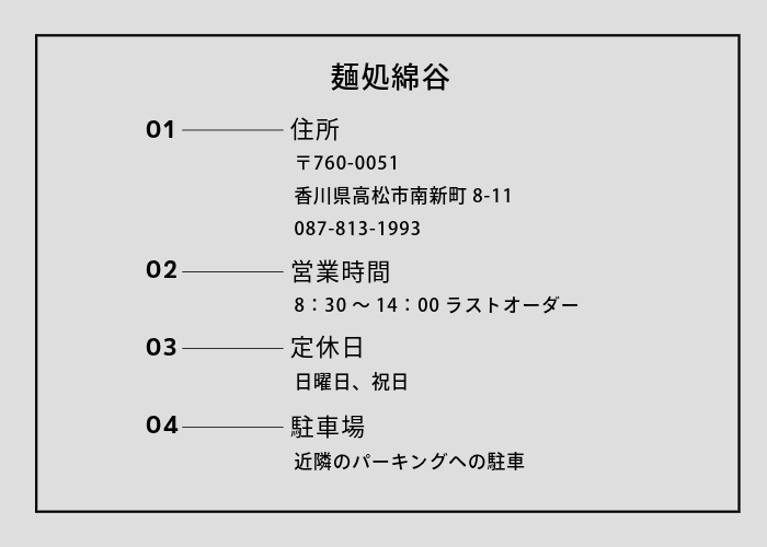皆様も高松市街地に来られた際は、「麺処綿谷」へ立ち寄ってみてはいかがでしょうか。